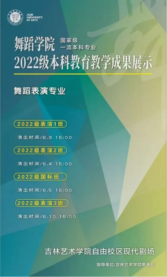 6月3日-13日舞蹈学院2022级本科教育教学成果展示于吉林艺术学院现代剧场成功举办。此次展演共5场,涵盖舞蹈表演(中国舞表演1班、中国舞表演2班、中国舞表演男班、国际标准舞班)与舞蹈编导两大专业方向,舞蹈学院学子们以三年磨一剑的专业积淀,呈现出“从课堂到舞台”的华丽蜕变。