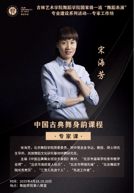 4月18—20日,吉林艺术学院舞蹈学院国家级一流“舞蹈表演”专业建设系列活动--专家工作坊,特邀北京舞蹈学院党委委员、北京舞蹈学院附中党总支书记宋海芳教授为我院师生带来精彩的中国古典舞身韵专家课,在一呼一吸间,共同感受中国古典舞的魅力。