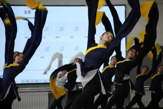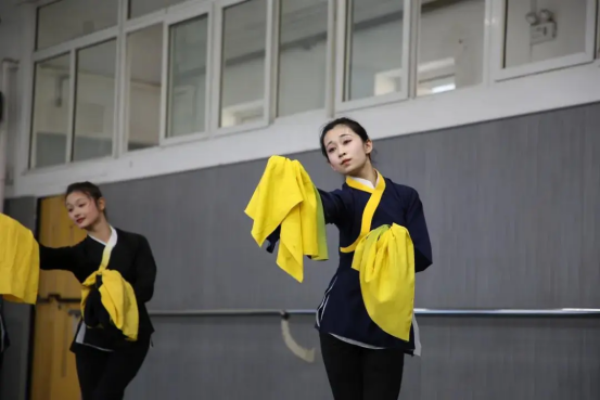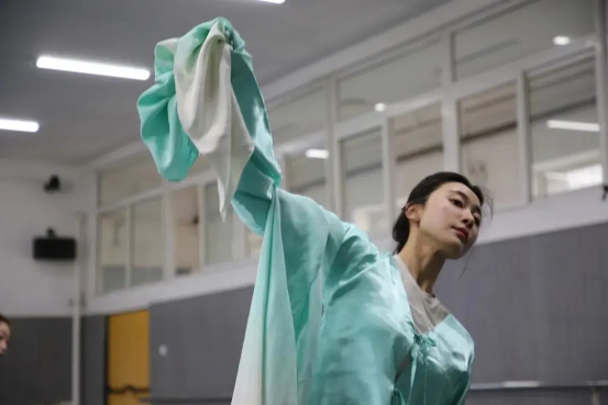 中国古典舞袖舞课程是一门融合历史传承、技法训练与文化审美的系统性教学体系,通过“以身带袖、以袖练身”,最后实现“身袖合一”。宋教授通过动作示范、重复练习等方法,逐步引导学生掌握袖舞技法,进而通过情境设定及情感主题进行分组练习,强化学生对袖舞文化内涵的领悟,将理论与实践结合,体悟东方美学精髓,为舞蹈表演与创作注入深厚的文化底蕴。